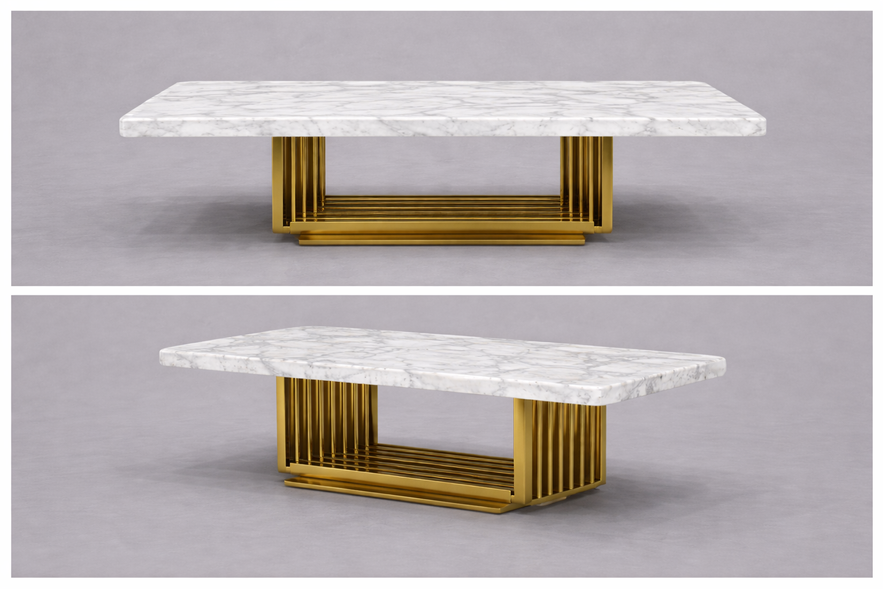 A striking modern table defined by its geometric metal base and luxurious marble surface.