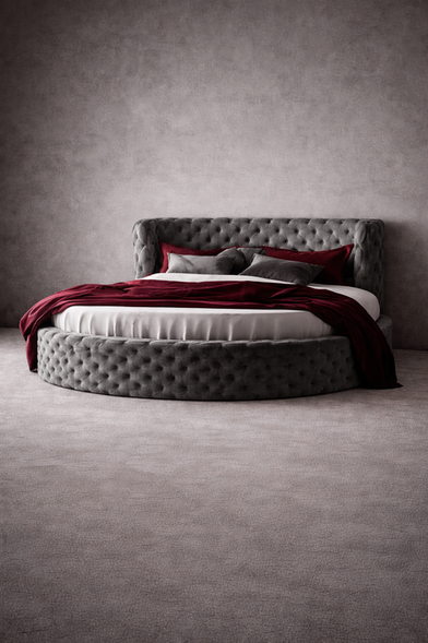 Break away from tradition with this stunning round bed, featuring classic deep-button tufting and a wrap-around cushioned headboard. This unique silhouette is fully customizable in size to ensure it serves as the perfect centerpiece for your space. For a final touch of luxury, you may choose to have it upholstered in any of our high-end fabrics or leathers.