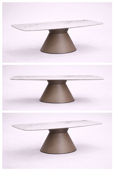 This dining table features a sleek marble top paired with a sculpted metallic pedestal base, presented as a fixed design and not customisable.
