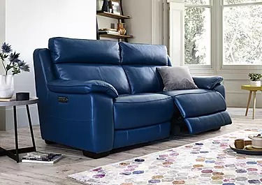 A navy blue leather reclining sofa with plush cushions and contemporary design, offering both luxury and comfort.