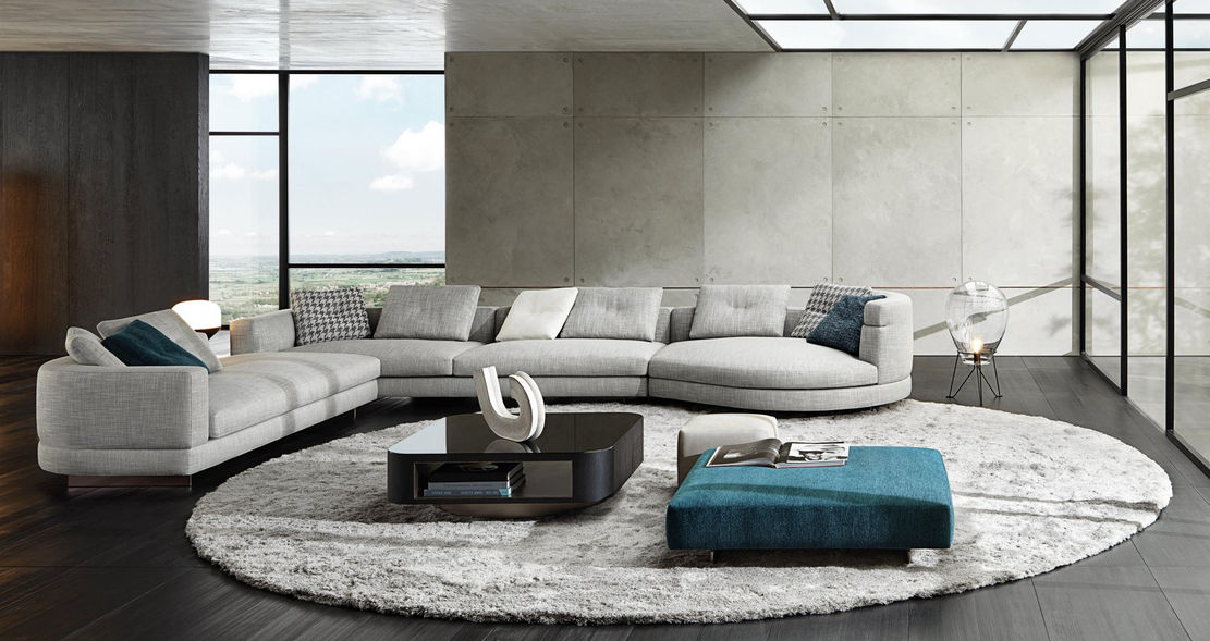 The sofa embodies a luxurious, contemporary look, perfect for a high-end modern interior. The combination of soft textures, neutral colors, and bold geometric elements makes it a statement piece while maintaining a cozy and inviting atmosphere.