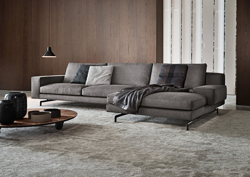 A grey, L-shaped sectional with clean lines and minimalist styling. It blends comfort with modern simplicity for a sleek living space.
